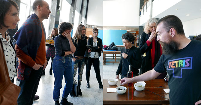 In a fluid way, the object is to convert everyday gestures and acts into a participatory sound experience as a strategy for the realization of sensitive sound artistic situations (taste / smell / hearing) transforming a space of the faculty into an Action, a multi-sensory artistic experience. The edible elements used produce sounds which are electronically processed generating preformative pieces turning them into a sound and visual score extended over time, thus offering an invitation to listen, wait and taste. Stressing that any act with the precise artistic intention becomes art and that everyday actions can also be felt as a sublime act.