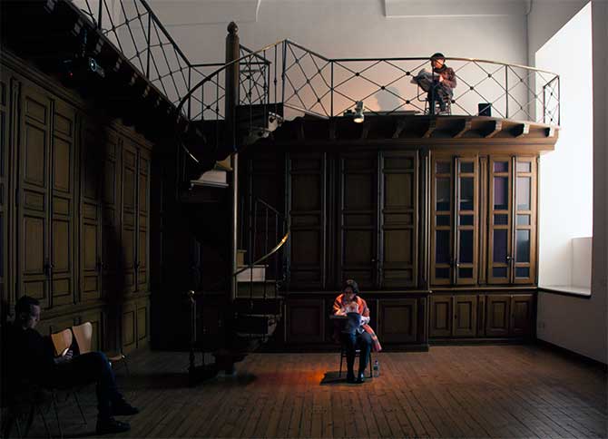 [ENG] The protocol of this performance, inspired by a passage from Ricardo Piglia’s novel, is the following: various collaborators of the artist will travel to sites of interest in Madrid, where they will describe what they see and hear, before reciting their descriptions as a prayer and recording it as an audio archive to be later transcribed as text. Different scenes, understood as shots or a storyboard, will be selected from the text and “pondered”, mixed and numbered. Once in the exhibition rooms, two performers, located on different levels, will act for each other, alternately reading scenes and, through their litany, invoking the situations described. |