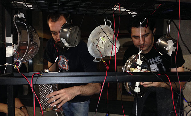 The cacerolada is composed of a lot of pans, pots and typical kitchen utensils. They are driven via solenoids, motors and servomotors mainly, but it is not excluded to add some other electromechanical. The apparent purpose of this piece oscillates between the protest and the deactivation of the protest. It is not clear. But mainly it is a kind of open game with the ability to be used as a musical and performative instrument. But its main interest lies in sharing the development of the project and the possibility of offer the tools used for its realizationto to the community, so that anyone can replicate or transform it at one want. This past year, many popular initiatives have emerged in the same direction. The problem is the null information to replicate them and less to be able to "perform" with them (Without synchronization and intention capability with dynamics, nor do they allow them to be integrated in an environment of common electronic instruments). |