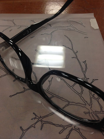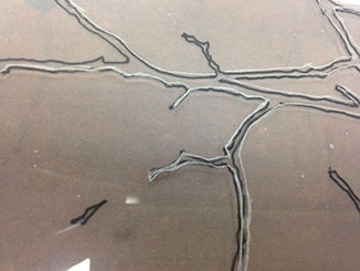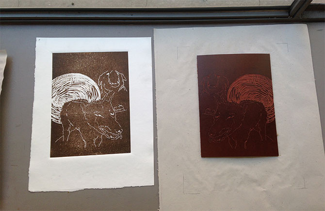 [ES] Sobre la plancha se realiza el dibujo a lápiz o se traslada con un calco el modelo que se desea estampar. Es importante darse cuenta que el grabado saldrá invertido, por eso se debe pasar a la plancha con el calco invertido. |