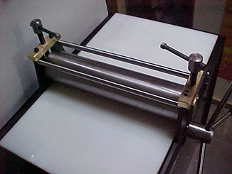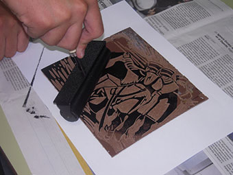 Inking Next, on the carved plate or matrix, ink is applied with a rubber roller, printing ink or oil can be used. The ink is pre-spread on a glass or acetate. The roller should not be loaded with much ink, so it can be downloaded in a clean area of glass. The ink must also be beaten well on the glass to achieve uniformity and eliminate possible lumps, etc. |