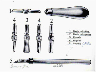 Emptying of surface The gouge is a cutting instrument, so the good placement of the hands is essential. Care must be taken to always place the hand to the side or behind, holding the linoleum, -never in front-, thus avoiding possible cuts The use tof he blade attacking perpendicularly the linoleum on either side of the drawing, holding the blade with the right and the plate with the left rotating at all times to get the most correct position. Once the drawing is outlined, proceed to remove with another type of gouge the parts that were white, this way emptying the linoleum through successive cuts in the form of curved, wavy, broken lines; It is posible to attack the linoleum directly with the V-shaped gouge and cut the contour of the image, the cuts of this gouge are angular, deep, narrow and V-shaped. The gouge makes rounded cuts |