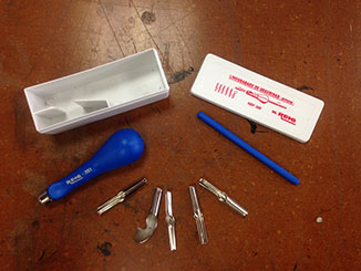 Vaciado de superficie La gubia es un instrumento cortante, por lo que la buena colocación de las manos es imprescindible. Se tendrá la precaución de situar la mano siempre al lado o detrás, sujetando el linóleo, -nunca delante-, así se evitarán posibles cortes. Utilización de la cuchilla atacando perpendicularmente el linóleo a uno y otro lado del dibujo, sujetando la cuchilla con la derecha y la plancha con la izquierda pudiéndola girar en todo momento para obtener la posición más correcta. Una vez contorneado el dibujo se procede a sacar con otro tipo de gubia las partes que resultaran blancas, y así vaciar el linóleo mediante sucesivos cortes en forma de líneas curvas, onduladas, quebradas; punteando o desprendiendo una amplia zona,que deberán ser más profundas para evitar que se manchen de tinta. Se puede atacar el linóleo directamente con la gubia en forma de V y cortar el contorno de la imagen, los cortes de esta gubia son angulosos, profundos, estrechos y tienen forma de V. La gubia hace cortes redondeados. |