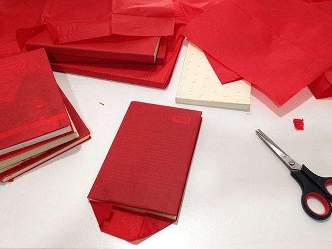 Esta vez la artista Anna Katarina Martin ha forrado su selección de títulos con papel color rojo, de modo que cada título se mantiene "en su lugar" sin salir de los estantes. Aquí puedes ver parte del listado que ha titulado #NotasAlMargen. |