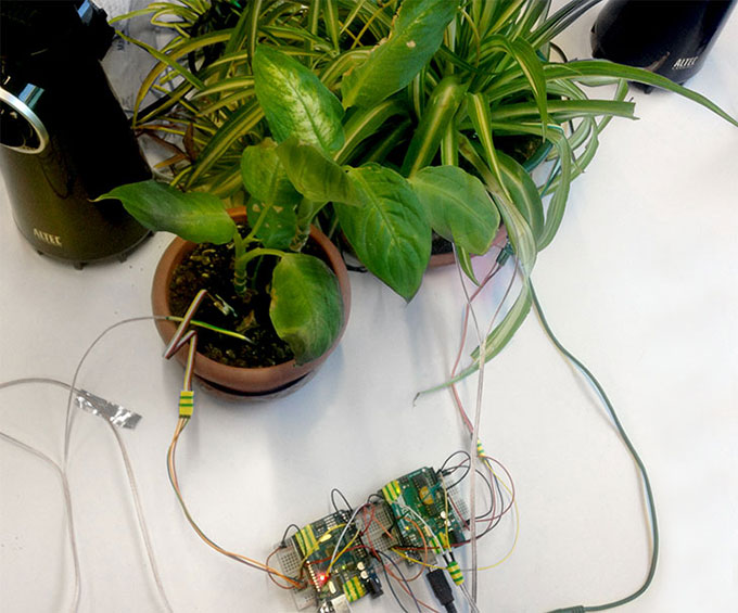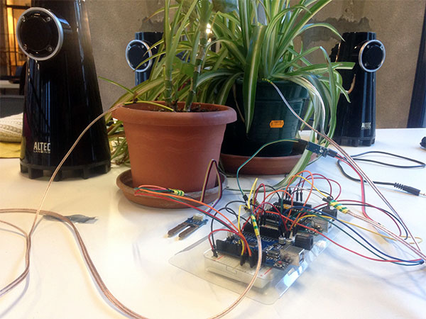 [ES] Conectar componentes electrónicos convencionales a una planta viva, combinar circuitos digitales y analógicos, más la fabricación de sonidos artificiales, y crear un facilitador de frecuencias que emanan de plantas vivas, que con la ayuda de la electrónica invitan a escuchar de cerca los ritmos y frecuencias reproducidos por la naturaleza. El concepto principal es convertir lo vegetal y orgánico en una parte vital de la electrónica (o al revés). Se trata de un dispositivo sensible a la atmosfera, a la manipulación y la interacción con los sensores que transforman los valores lumínicos y los niveles de humedad de diferentes plantas en un paisaje sonoro.
