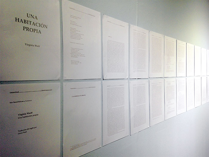 Esta frase de Virginia Woolf sigue vigente hoy en día: busca tu mundo, tu espacio, tu independencia como mujer. A partir de un trabajo previo sobre la relación existente entre la intimidad escogida conscientemente y el proceso creativo, definir y relacionar esta definición con el ensayo Un cuarto propio de Virginia Woolf, escrito en 1929. Es una reflexión acerca del contexto que rodea la producción artística desde una perspectiva de género. Se ha insistido en que la sensibilidad femenina, tiene un carácter híbrido, resbaladizo, flexible. Intentar ponerlo en palabras, convertirlo en texto, ver si es esto es posible, y partir de aquí dar forma y desarrollar la propuesta expositiva presente. Virginia Woolf no solo veía la creación de las mujeres como un “no poder hacer, sino como un hacer diferente”. Nunca pudo quitarse de la cabeza "el sonido" de su propia escritura. Esta propuesta enfatiza lo sonoro. Dejar la puerta abierta con la idea de invitar a otras, llenarlo con sus historias, sus voces. Un susurro en un lugar determinado que conforma el cuerpo sonoro y el contexto de estas piezas. Se ha elegido llamar las obras Secuencias: una serie de obras específicas cuyos conceptos se relacionan con el arte sonoro y la realización de interpretaciones breves. Obras que se muestran durante un cierto período de tiempo. La intención es una forma de escucha del espacio. Si la obra cambia a otro lugar, el trabajo ya no es el mismo, está en constante cambio. Así, como en el sentido alemán klangkunst, se convierte en un puente entre el arte sonoro, la acústica espacial y la percepción. Una reflexion colectiva y conjunta sobre la construcción del conocimiento a través de la escucha. La escucha como elemento transversal de diferentes disciplinas y como herramienta básica para la transformación de la educación y el aprendizaje.