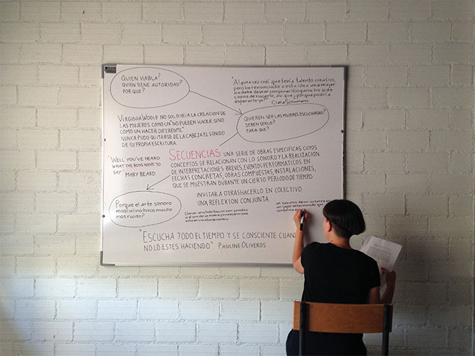 [ES] Instalación multimedia – obras sonoras varias y cambiantes durante el tiempo de exposición Habitación/ Descripción instalación: La tesis que Virginia Woolf se va desgranando a lo largo de seis capítulos y 150 páginas de Un cuarto propio: transcrito y colgado en la pared. Una maquina de escribir sobre una mesa, una silla. Dos sillónes, cómodos, y una lampara para leer. En la mesa una Escultura tímida: Dos copas de vino que vibran, activados las frecuencias de un altavoz atornillado a la mesa. Se chocan nerviosamente entre ellas, creando ese sonido que solo la porcelana produce al temblar y chocarse entre si... La escultura entera amenaza con caerse. Copas sonoras que ponen el dedo en el tema central, que ese movimiento es el requisito para el sonido. Conversaciónes: obras sonoras en auriculares colocados en la habitación. Tienen titulos como; Buscar un lugar, Esto es mío etc. Las piezas sonoras se construyen rítmicamente a partir de entrevistas con varias personas, que consisten en sus historias, sobre las relaciones entre ellas y las cosas y lugares. Material recopilado que se convierten en narraciones; frases y paseos por diferentes paisaje sonoros. Paisajes sonoros/ Obras sobre aspectos espaciales: Sonidos de agua en una habitación, desde pequeñas gotas hasta olas de un oceano. Aquí, de repente, la escucha profunda, los sonidos profundos, donde se puede medir distancias con el oído. Y en el medio, una búsqueda febril de silencios. La intención es una forma de escucha del espacio. Llenar la habitación con sonido. Si el sonido se mueve a otro lugar, el trabajo ya no es el mismo, esta en constante cambio. Así, como en el sentido alemán klangkunst, se convierte en un puente entre el arte sonoro, la acústica espacial y la percepción. Superficie, un retrato del cliché sobre las aspiraciones de los artistas que se esfuerzan un deseo imposible, autorreferencial, que sigue siendo un concepto. La grabación de una intimidad emocional evoca de la presencia de un cuerpo invisible. Una voz que atrae al oyente hacia él. Se dice que a los estudiantes de Pitágoras se les prohibió ver a sus maestros durante los primeros cinco años de estudio. Se mantuvo detrás de una sugerencia de que los estudiantes, llamados akousmatikoi, se centrarían solo en lo dicho. Pierre Schaeffer, de la música concreta, reintrodujo la palabra a mediados del siglo XX con la idea de la escucha acusmática, donde los sonidos se liberaban de una fuente de sonido reconocible. De manera similar, esta pieza evita todas las pistas visibles. ¿De dónde viene la voz? Esta incertidumbre primaria lleva al músico y crítico Michel Chion, en La Voix au cinéma (1982), a llamarlo la voz invisible pero todopoderosa en el cine. La acoustmêtre (être: 'estar, ser'). En una habitación, poder sentarte, escuchar el afuera y el adentro, los pequeños elementos mezclados con las propias señales del cuerpo. Trabajar con las secuelas y las distorsiones acústicas de los sonidos del lugar. Sobre todo, lo fácil, lo directo, con rasgos neodadaistas, como las vibraciones de baja frecuencia que crean las tranvias y hacen las copas de vino en un mesa vibrar.