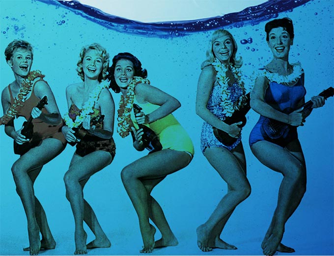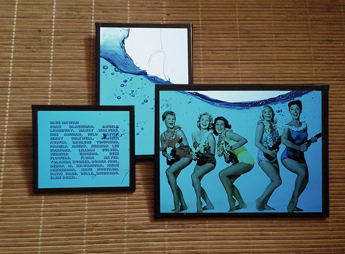 Blue Hawaii distorts the image of a poster of the time and delves into artificial symbolic manufacture, mixing cocktail and cinematography, both serving the interests of the business of the exotic. To do this, the landscape is taken as a unconflicted key, the promoting of behaviors in society through movie stars and an underlying masked chauvinism after the festive.