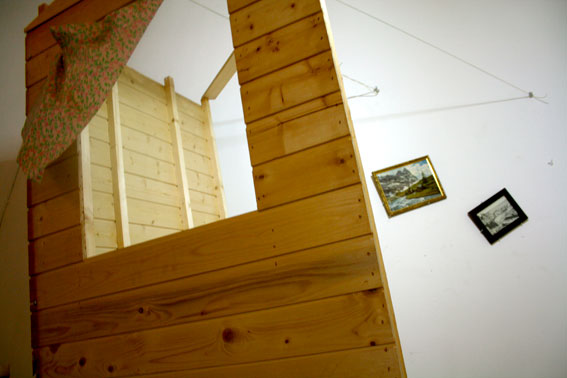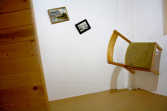 This work has an innocent sense of humor, and at the same time there is something too normal in the piece where something extraordinary is happening. An home that flew through the air to stamp itself inside the exhibition space, literally embedded in the wall.