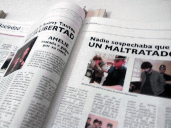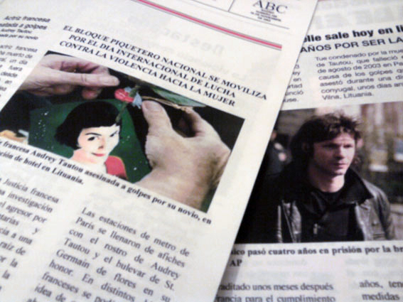[ENG] The death of Amelie deals with gender violence but, above all, the construction of stereotypes in the cinema and the media, using the sensational press format. The work is divided into two parts separated by time. On one hand The death of Amelie (2004) and on the other, The murderer of Amelie is released (2011). Audrey Tautou, from actress protagonist and model of femininity, to icon for young European feminists, after her violent death by the hand of her boyfriend. The first part relate the emotional goodbye and as the news of his death touches the world of cinema, provoking large feminist demonstrations against violence against women and gender abuse. Thousands of fans, filmmakers and fans go out to express their grief by the loss of one of the most beloved actresses in European cinema. By her tragic end, dead too young, victim of a macho society she is forever immortalized as another myth of the big screen for her role in Le Fabuleux Déstin du Amelie Poulain. Underlying this first piece is the questioning of Amelie as a symbol for women and their subsequent conversion into feminist icon, given the characteristics of the character.