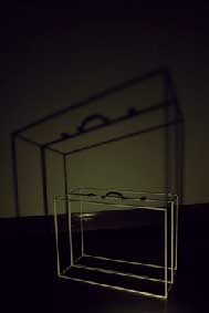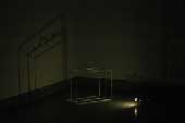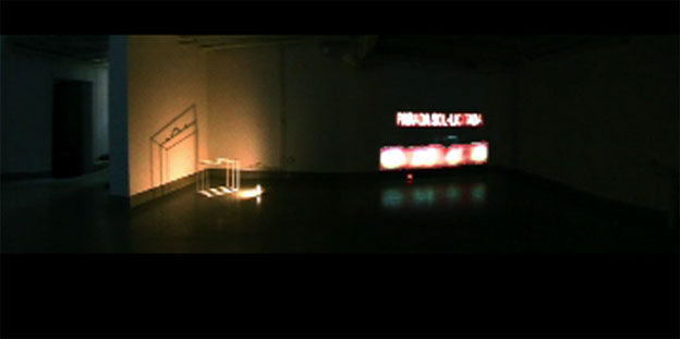 Escultura de hierro, video monocanal, cartel luminoso, focos.