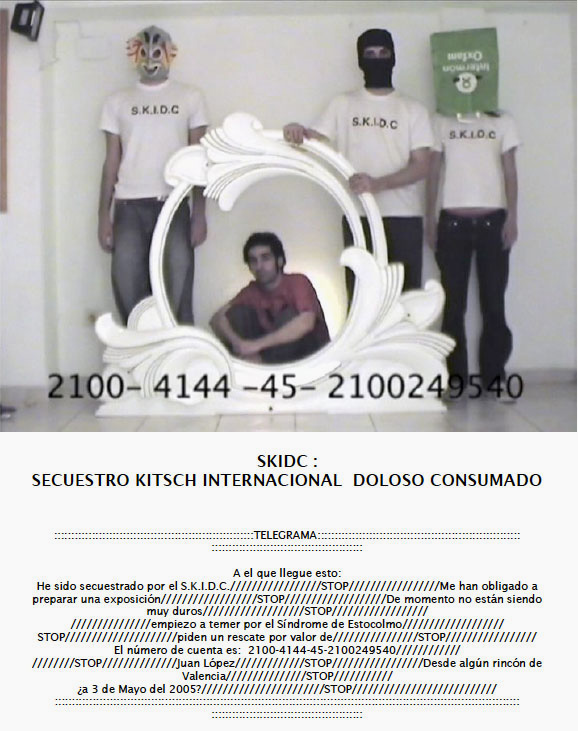 Parte del proyecto JUAN LOPÉZ ESTOCOLMO ES POCO - SECUESTRO KITSCH INTERNACIONAL, Galería Kitsch, Valencia 2005. Sindromes: Ananda, Miguel Noguera, Anna Katarina Martin, Javier Alvarez. Artifices y comisariado WE ARE QQ y Juan Carlos Roldan |