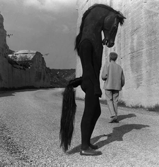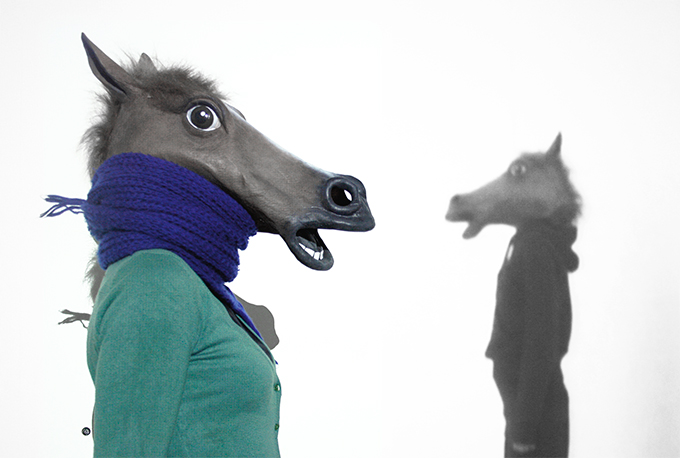 Explicación formal: la obra consiste es una video instalación en el que una persona –la artista- patina en un espacio neutro. El elemento que choca es que no se ve su rostro, ya que está cubierto por una cabeza de caballo. |