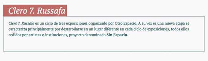 Clero 7. Russafa es un ciclo de tres exposiciones organizado por Otro Espacio. A su vez es una nueva etapa se caracteriza principalmente por desarrollarse en un lugar diferente en cada ciclo de exposiciones, todos ellos cedidos por artistas o instituciones, proyecto denominado Sin Espacio.