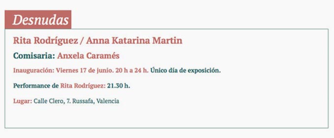 [VA] Rita Rodríguez i Anna Katarina Martin es despullen simbòlicament per a qüestionar el rol passiu, objectualitzat i normativitzat de la dona, tant a l’art com a la imatgineria de la cultura popular, ja que habitualment les dones són mostrades nues. Els seus cossos erotitzats i cossificats acaben per convertir-se en icones, a l’eliminar qualsevol capacitat d’acció com a subjectes. Per altra banda, en aquesta crítica a la representació, no sols reflexionen sobre els mecanismes de poder i control de la mirada vouyerista masculina, sinó que també revisen la seua pròpia pràctica artística.