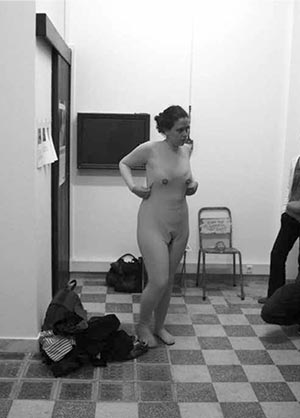 Performance clàssica a la manera tradicional -realitzada per primera vegada al 2009, dins del festival Chámalle X celebrat a Pontevedra- suposa una tornada de rosca a les primeres performances dels anys seixanta, en les quals les dones tractaven de buscar una veu pròpia dins del món de l’art, mogudes pels contestataris discursos socials i polítics del moment i, en especial, del pensament feminista. D’aquesta manera, Rita Rodríguez revisa l’esteriotip de la performer “clàssica”, la qual buscava apropiar- se del cos, però que paradògicament ha acabat sent absorvit pel sistema de l’art. El fet que despullar- se continue sent per a les dones la manera més ràpida i efectiva d’entrar a formar part d’un museu, suposa haver perdut gran part de la seua càrrega subversiva inicial. L’artista ironitza sobre aquest ús del cos realitzant una acció en la qual, en un espai interior, es desvisteix per a acabar mostrant una disfressa de nua, amb la qual poder completar el ritual performàtic al carrer, al eixir “vestida” d’aquesta forma per a tractar de transgredir els límits entre l’espai públic i privat. |