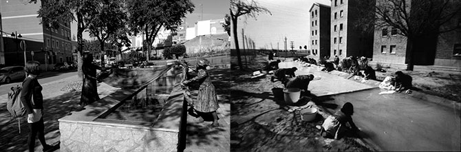 Cada territorio genera experiencias de vida diversas cuya memoria se refleja en el paisaje, el espacio urbano o el patrimonio, imprimiendo un carácter y una identidad particular a cada lugar. Uno de los factores determinantes en la configuración del paisaje es el agua. Hay una curiosa interrelación de las mujeres con las tareas relacionadas con el agua. Desde mediados del siglo XIX, cuando se construyó la Fuente de los Peces (1850), un sitio espacioso y céntrico de la Villa, se utilizaron las aguas sobrantes, conducidas por una cañería de plomo, para alimentar el lavadero que se situaba al sur en la periferia del pueblo, en la plazuela donde se juntaban las calles del Pradillo y de la Sierra conocido en aquellas épocas como La Charquilla. Consistía en una sencilla charca donde las mujeres de Móstoles lavaban la ropa, utilizando para ello las tablas de lavar, cuya superficie de madera tenía una serie de relieves o corrugaciones para frotar la ropa enjabonada. Las obras de remodelación respetaron los pilones y el caño, quedando dicho lavadero como recuerdo histórico y elemento ornamental de la plaza en la que se ubica, de allí su nombre actual la Plaza del Lavadero. Ahora hay una nueva reproducción del antiguo lavadero con un grupo escultórico junto a él. Este grupo escultórico representa a dos mujeres sujetando una tela que están lavando, mostrando claramente la labor se desempeñaba en el lugar en el siglo pasado. El conjunto rinde homenaje a las mujeres mostoleñas que durante tantas generaciones acudieron a esta instalación pública para lavar las prendas propias y las de su familia, reconociendo así el importante papel que la mujer ha jugado siempre en la familia. | |||