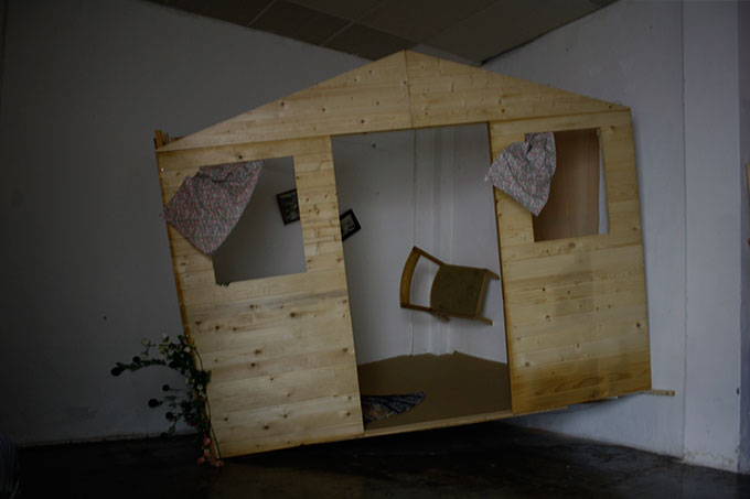 Esta obra tiene cierto sentido de humor inocente, y a la vez hay algo demasiado normal en la pieza donde algo extraordinario está ocurriendo. Un domicilio que ha volado por los aires para estamparse dentro del espacio expositivo, literalmente empotrado en la pared.