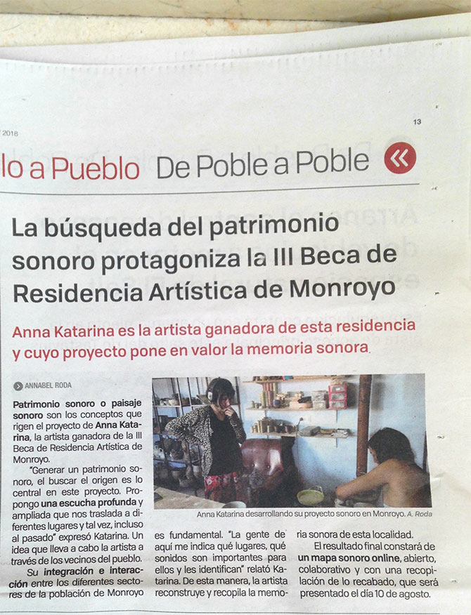 Patrimonio sooro o paisaje sonoro son los conceptos que rigen el proyecto de Anna Katarina, la artista ganadora de la lll Beca de Residencia Artística de Monroyo. |