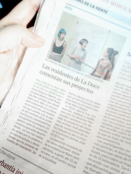 [ES] Hoy • Galería La Doce (Boiro) • De 10.00 a 14.00 y entre las 16.30 y las 20.30 horas • Anna Katarina Martín, Laura López Balza y Judit Porto, las tres artistas que desde hace unos días se encuentran trabajando en La Doce, en el marco de una residencia que cuenta con el apoyo del Instituto de la Juventud (Injuve), conversarán hoy con quienes se acerquen a la galería sobre los proyectos creativos que están desarrollando. Las tres han realizado salidas por la comarca a la caza de paisajes y sensaciones que les sirvieran de fuentes de inspiración. De hecho, algunas de las obras que ya han finalizado están expuestas en el espacio que dirige María Magán. La Doce abrirá hoy sus puertas, mañana y tarde, para que las personas interesadas conozcan con detalle los proyectos de estas tres artistas. Está previsto que las conclusiones de estos trabajos se den a conocer el próximo viernes, a las 20.30 horas. La exposición completa de las obras realizadas durante su estancia en Boiro será exhibida, a partir del 15 de octubre, en el centro social de la localidad. |